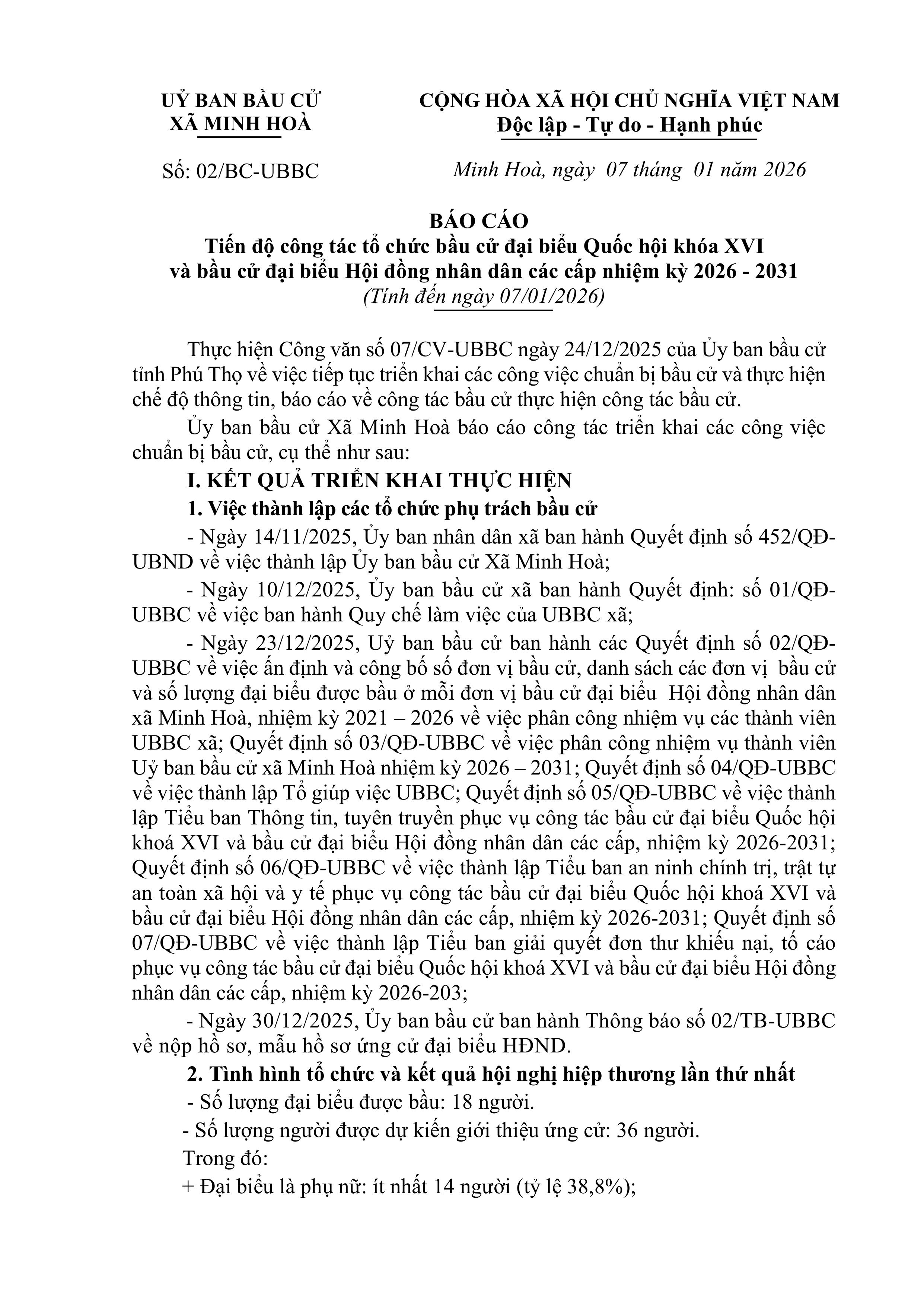 Báo cáo tiến độ công tác bầu cử xã MINH HOÀ (tính đến 25/2/2026)