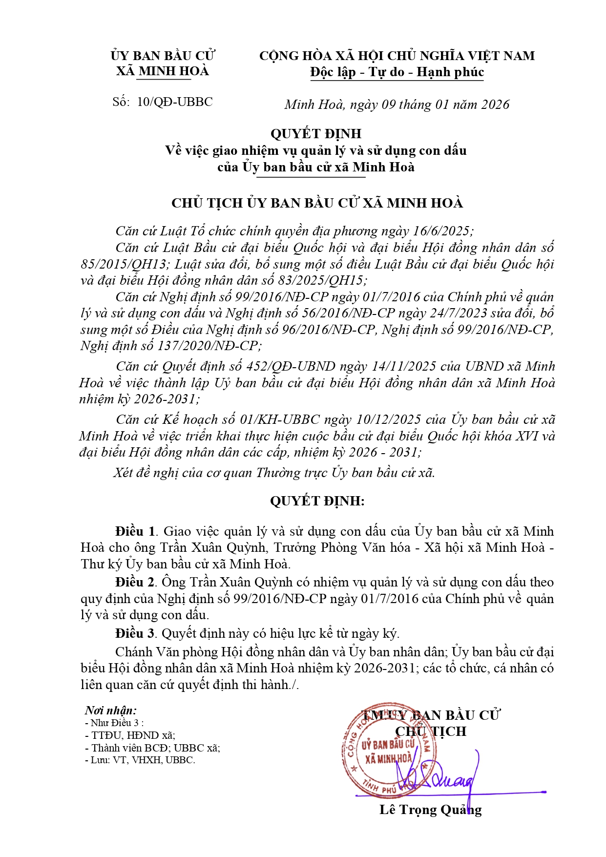 QUYẾT ĐỊNH Về việc giao nhiệm vụ quản lý và sử dụng con dấu của Ủy ban bầu cử xã Minh Hoà