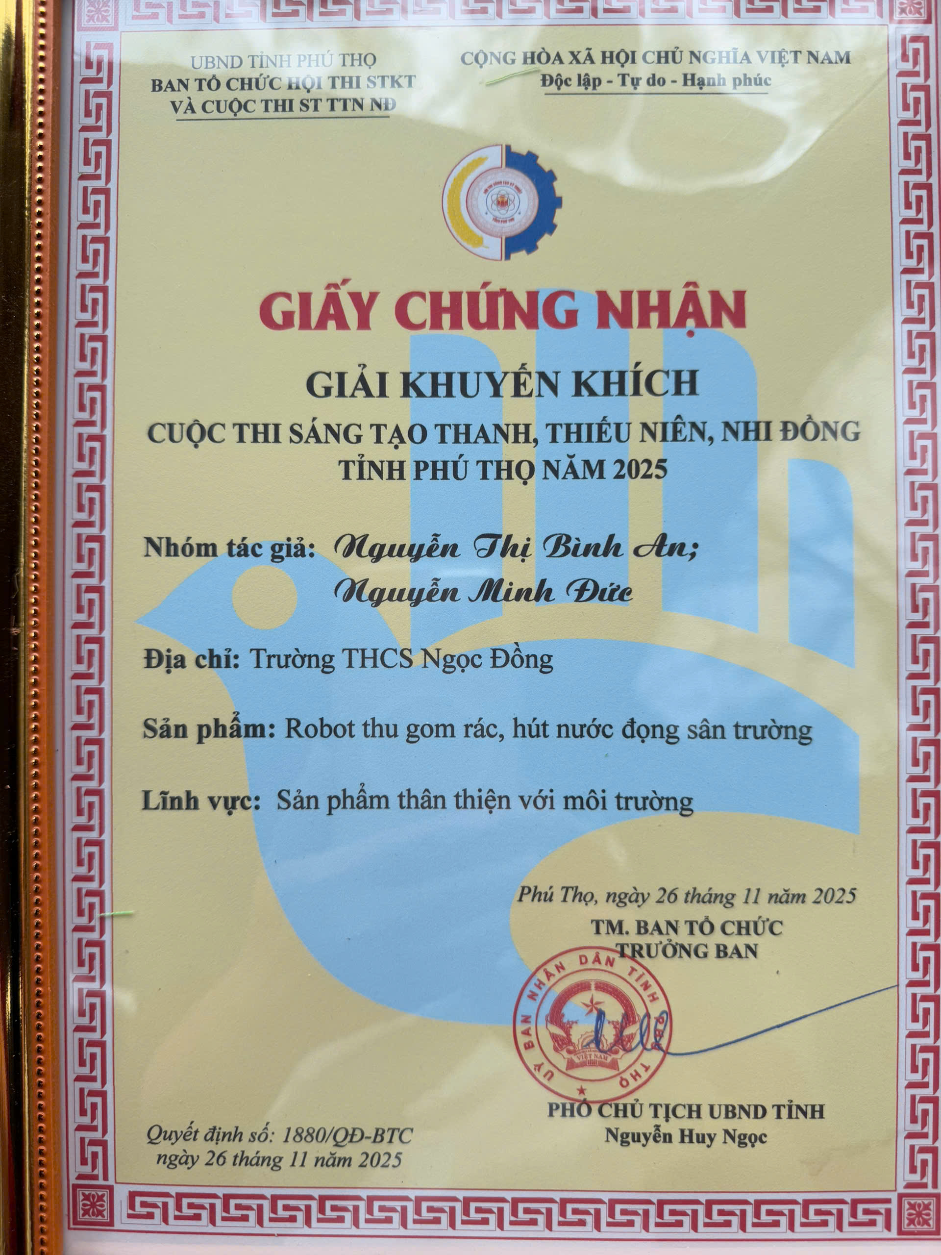 Với sản phẩm “Robot thu gom rác, hút nước đọng sân trường” nhóm tác giả Nguyễn Thị Bình An, Nguyễn Minh Đức, học sinh Trường THCS Ngọc Đồng, xã Minh Hòa, đã vinh dự được nhận giải Khuyến khích của cuộc thi.
