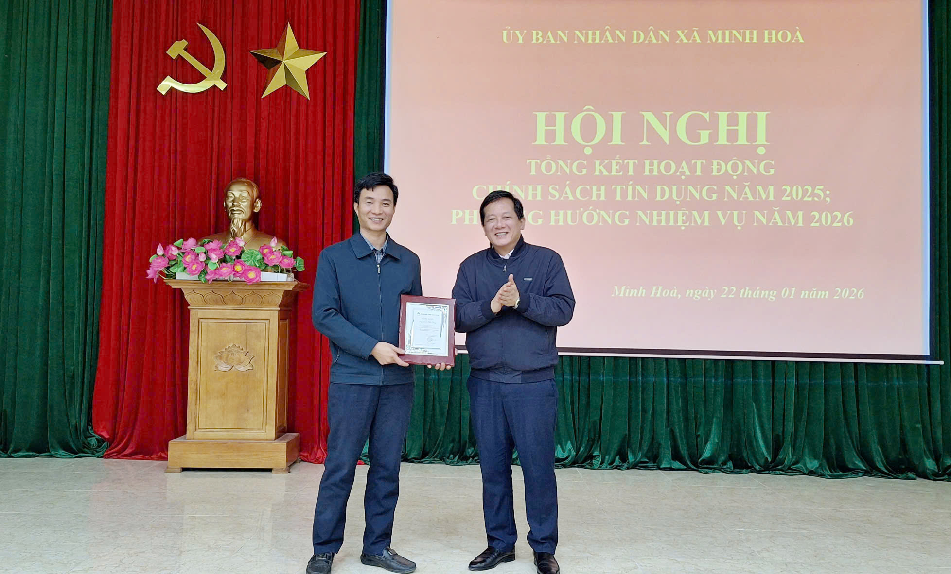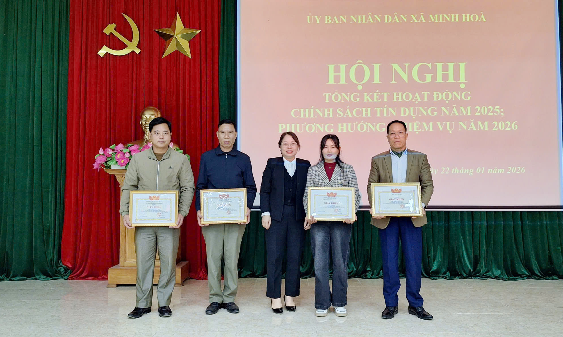 Nhân dịp này Ngân hàng chính sách xã hội Việt Nam đã vinh danh 01 cá nhân; UBND xã Minh Hòa tặng giấy khen cho 04 cá nhân có thành tích xuất sắc trong công tác hoạt động tín dụng chính sách xã hội năm 2025.